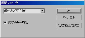 手続き型マッピングの展開マッピング手法は、テクスチャの歪みを除去します。ただし、結果として座標クラスタどうしが重なることがあります。[展開マッピング](Unfold Mapping)ダイアログ ボックスでは、面を展開する方法を制御します。