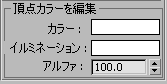 これらのコントロールを使用して、選択したポリゴンまたは要素上の頂点のカラー、発光カラー(シェーディング)、およびアルファ(透明)値を割り当てます。