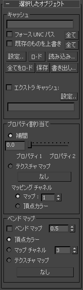 [選択したオブジェクト](Selected Object)ロールアウトでは、シミュレーション キャッシュの制御、テクスチャ マップまたは補間を使用した布のプロパティの制御やアニメート(オプション)、およびベンド マップの指定を行えます。このロールアウトは、シミュレーションで単一のオブジェクトが選択されている場合にのみ表示されます。