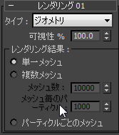 メッシュ数パーティクル フローがレンダラーに送信するメッシュ オブジェクトの最大数です。
