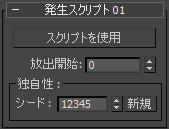 [発生スクリプト](Birth Script)オペレータを使用すると、MAXScript スクリプトを利用して、パーティクル フロー システム内にパーティクルを生成できます。スクリプトでは、MAXScript で利用可能な任意のプログラム機能を使用できます。