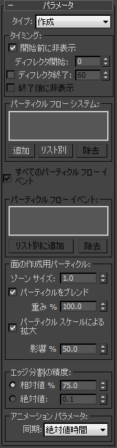 注: 重み、相対値、絶対値の設定をアニメートすることもできますが、アニメーションとパーティクルのタイミングは同期できません。