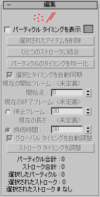 [編集](Editing)ロールアウトでは、不要なパーティクルを削除する、ストローク全体を削除する、ストロークとパーティクルのタイミングを調整する、パーティクルとストロークを選択してその選択データを[発生ペイント](Birth Paint)オペレータおよび[配置ペイント](Placement Paint)オペレータに渡す、といった操作を行うことができます。選択したパーティクル シードを、[移動](Move)や[回転](Rotate)など標準の 3ds Max ツールによって操作することはできません。