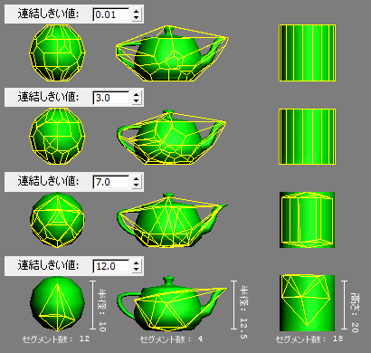 この設定は、パーティクル シェイプの頂点を連結することで衝突シェイプのメッシュ解像度を下げるために使用します。