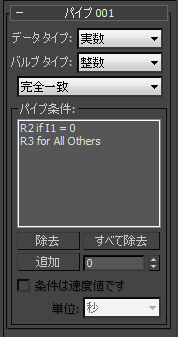 [パイプ条件](Pipe Conditions)領域のリスト ボックスには、パイプ処理されるデータ入力を決定するために使用される条件が表示されます。[ブール演算](Boolean)を除くすべてのバルブ タイプでは、これらの条件は指定した値に基づく範囲になります。既定では、バルブ タイプが[ブール演算](Boolean)以外の場合、条件(および入力)は 1 つで、[すべて](All)に設定されます。つまり、入力データは単純にパイプ処理されます。[追加](Add)ボタンで条件を追加します。