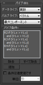 バルブの場合は、取り込み値 V1.x、V1.y、V1.z(ベクトルのコンポーネント)がバルブ コントローラになります。ドロップダウン リストでは、パイプ処理でのベクトル コンポーネントの使用方法として、[最大コンポーネント](Maximal Component)、[最大絶対値コンポーネント](Maximal Absolute Component)、[最小コンポーネント](Minimal Component)、または[最小絶対値コンポーネント](Minimal Absolute Component)を選択できます。[ベクトル](Vector)バルブ タイプでは、[追加](Add)および[除去](Remove)ボタンは使用できません。入力データ チャネルが 2 で固定されている[ブール演算](Boolean)バルブ タイプと同様に、入力データ チャネルの数は 3 で固定されています。