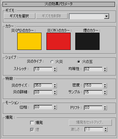 [爆発](Explosion)と[煙](Smoke)にチェックマークを付けると、内炎と外炎のカラーは煙のカラーにアニメートされます。[爆発](Explosion)と[煙](Smoke)のチェックマークを消すと、煙のカラーは無視されます。