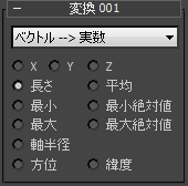 その他の場合は、インタフェースはラジオ ボタンの選択肢を提供します。たとえば、[リアル](Real) -> [ベクトル](Vector) を選択すると、浮動小数点の値をデカルト座標、円柱座標、または球座標のベクトルに変換します。このような場合、選択肢はインタフェースで説明されるか、一目瞭然の名前です。