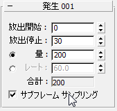 発生レートの値に、システムのフレーム/秒(fps)の値([時間設定](Time Configuration)ダイアログ ボックスで設定)の倍数でない整数を指定した場合、パーティクルが放出されるタイミングを決定するには補間が使用されます。たとえば、システムの既定値である 30 フレーム/秒を使用し、発生レートを 4 に設定した場合、[サブフレーム サンプリング](Subframe Sampling)にチェックマークが付いていなければ各パーティクルは 7 または 8 フレーム間隔で放出され、[サブフレーム サンプリング](Subframe Sampling)にチェックマークが付いていれば 7.5 フレーム間隔で放出されます。