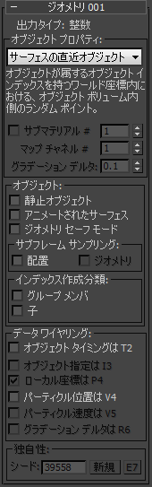ランダム シードを設定し、他のランダムにシードされた関数から動作を区別します。値を入力するか、[新規](New)をクリックして、[シード](Seed)の値を変更し、ランダムな動作を変化させます。ランダム サーフェス ポイントとランダム ボリューム ポイントのオブジェクト プロパティでのみ使用できます。