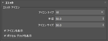 エミッタのアイコンのタイプを[球](Sphere)、[ボックス](Box)、[平面](Plane)、または[カスタム](Custom)から選択します。