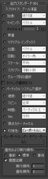 注: 標準の PFlow オペレータで加速プロパティまたは質量プロパティを作成するものはありません。ただし、([出力スタンダード](Output Standard)サブオペレータを使用して)加速プロパティが作成される場合は、パーティクル フロー システムは指定された加速のルールに従います。たとえば、重力の影響をシミュレートするには、出力として加速度の値を定義できます。