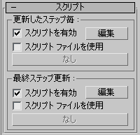 [スクリプト ファイルを使用](Use Script File)にチェックマークが付いていない場合、ここには既定の[更新したステップ毎](Every Step Update)スクリプト(3dsmax¥scripts¥particleflow¥example-everystepupdate.ms)が表示されます。[スクリプト ファイルを使用](Use Script File)がオンの場合、スクリプトをロードしていれば、ここにはロードしたスクリプトが表示されます。スクリプトをロードしていない場合、[編集](Edit)をクリックすると[開く](Open)ダイアログ ボックスが表示されます。