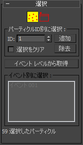 これらのコントロールを使用して、パーティクルごとまたはイベント ベースでパーティクルを選択します。[イベント](Event)レベルでパーティクルを選択するのは、デバッグとトラックを目的とする場合です。パーティクル レベルで選択したパーティクルは、[削除](Delete)オペレータ、[選択をグループ](Group Selection)オペレータ、および[分割選択](Split Selected)テストでコントロールできます。選択したパーティクルを、[移動](Move)や[回転](Rotate)など標準の 3ds Max ツールによって操作することはできません。