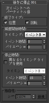 - 各パーティクルを停止する時間を指定します。指定した時間になると、パーティクルの移動やスピンが完全に停止し、次のイベントにリダイレクト可能になります。パラメータのラベルは、[タイミング](Timing)の選択内容(前述を参照)によって異なります。