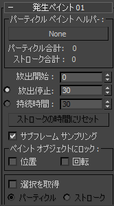 • [放出停止](Emit Stop)パーティクルのエミットを終了するフレーム番号を設定します。Particle Paint ヘルパー内のすべてのストロークの放出が完了するまでの時間が、[エミット開始](Emit Start)から[エミット停止](Emit Stop)までの時間に合わせてスケーリングされます。