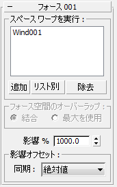 このボタンをクリックし、[フォース スペース ワープを選択](Select Force Space Warps)ダイアログ ボックスを使用して、1 つ以上のスペース ワープをリストに追加します。スペース ワープは、シーン内にあらかじめ存在している必要があります。