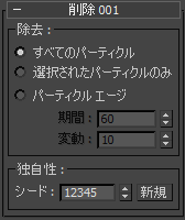 イベント内の[パーティクル](Particle)サブオブジェクト レベルで選択されたパーティクルが即座に削除されます。[選択](Selection)ロールアウトを参照してください。