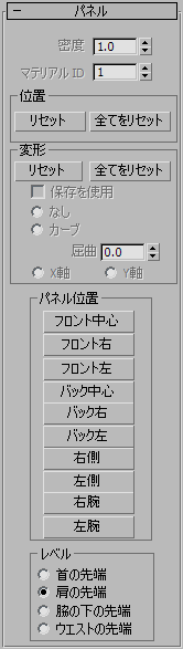 [服飾メーカー](Garment Maker)モディファイヤの[パネル](Panels)サブオブジェクト レベルでは、パターンのパネルを位置調整またはベンドし、オブジェクトやフィギュアに適合させることができます。
