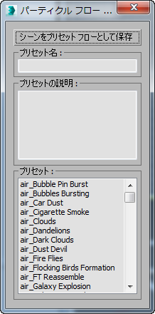 - 現在のシーンをプリセットとして保存します。プリセットは 2 つのファイルとして保存されます。プリセットの説明を含む preset_name.txt と、シーンそのものを含む preset_name.max ファイルです。どちらのファイルもインストール フォルダ内の /plugcfg/particle flow presets/ に保存されます。プリセットはファイルとして保存されるため、ファイル操作によってプリセットを交換したり修正することができます。