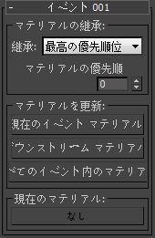 このセクションでは、イベント タイトル バーをクリックしてアクセスするマテリアル継承コントロール、およびマテリアルを使用するオペレータに追加される新しいパラメータである[サブ マテリアル ID オフセット](Sub-Mtl ID Offset)について説明します。