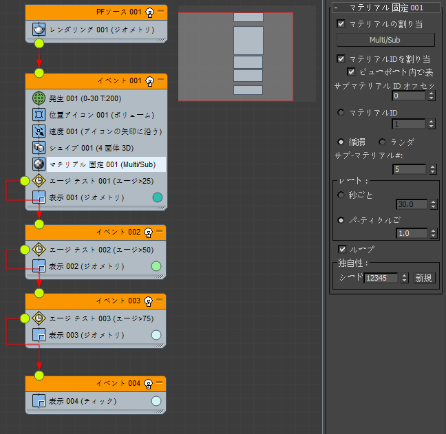 ここで、[マテリアル 固定](Material Static)オペレータを[イベント 01](Event 01)に追加して選択し、マテリアル エディタ(最初のスロット)からマルチ/サブ オブジェクト マテリアルをインスタンスとして(既定のモード)割り当て、マテリアル固定パラメータを調整して、サブマテリアルを循環します。イベント マップは次のようになります。