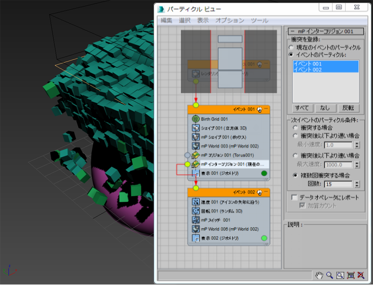 mParticles インターコリジョン テストをイベントに追加することは、mParticles コリジョン テストで[次イベントのパーティクル条件](Test True If Particle)オプションをオンにすることとほぼ同じです。パーティクル フローは衝突に関する情報の収集を開始します。mParticles コリジョン テストの場合と同様、この情報収集ジョブではかなりの CPU リソースを必要とするため、互いの衝突状況に基づき、パーティクルを他のイベントにリダイレクトする必要がない場合にはテストを追加しないでください。