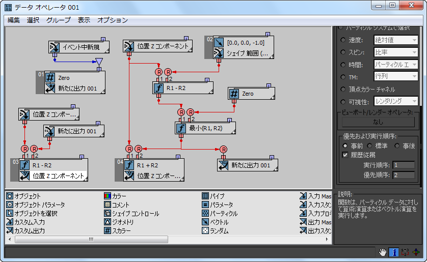 このシナリオには 2 つのデータ ストリームがあります。1 つ目のストリームでは初期値を計算し、2 つ目のストリームではパーティクルのプロパティを変更します。1 つ目のストリームの出力サブオペレータでは[実行順序](Execution Order)の値を 1 にする必要があり、ほとんどの場合そのフィルタ入力は[入力スタンダード](Input Standard)