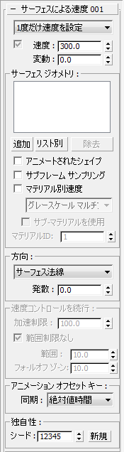 [サブ-マテリアルを使用](Use Sub-Material)このチェック ボックスにチェックマークが付いている場合、サーフェス ジオメトリ オブジェクトに割り当てられたマルチ/サブオブジェクト マテリアルから取得したサブマテリアルを使用して、速度が定義されます。