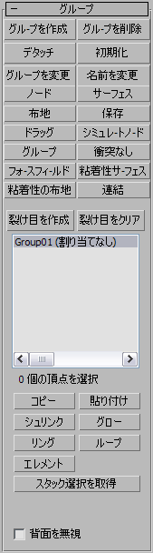 [グループ](Group)サブオブジェクト ロールアウトは、頂点グループを選択して、サーフェス、衝突オブジェクト、またはその他の布オブジェクトにコンストレイントする場合に使用します。