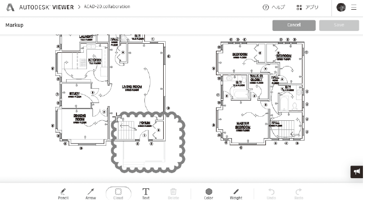 [マークアップ]をクリックすると、注記を記入するためのツールが表示されます。文字や雲マークなどを配置した後、ビューを保存できます。