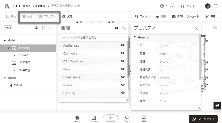 共有されたビューは Autodesk Viewer 左側の領域からモデルとレイアウトのビューの表示切り替えが行えます。