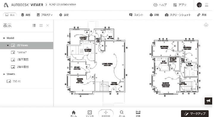 Autodesk アカウントにサインインした状態では Autodesk Viewer は下図のように表示されます。画面右上にはコメントの記入や印刷、スクリーンショット、共有リンクを表示するためのツールが配置されています。
