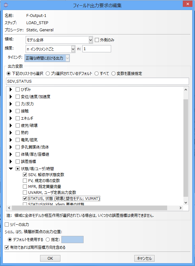 Abaqus/CAE を使用するか、テキスト エディタで入力ファイルを手動で編集することで、変数 STATUS を出力の要求に追加できます。Abaqus/CAE の場合: