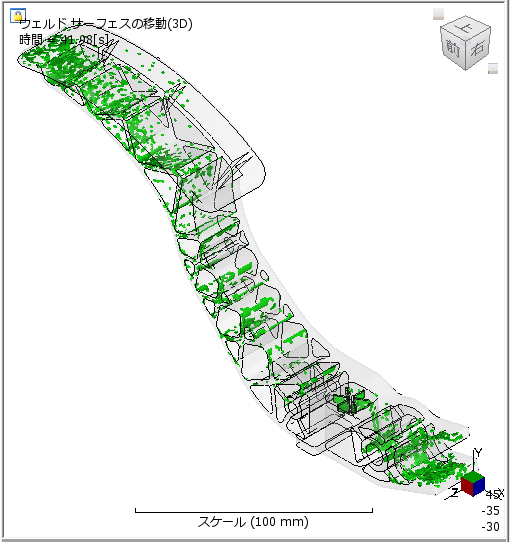 ペダル アームには Moldflow からのウェルド サーフェスのデータが含まれています。ウェルド サーフェスがペダル アームの構造寿命に与える影響を理解するには、まず、ウェルド サーフェス上の各点の強度低減係数を計算する必要があります。
