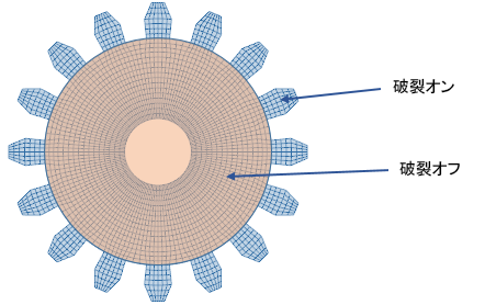 使用例を見てみましょう。この例では、歯車モデルの中で破壊が予想されない領域について、破損をオフにします。ここでは実験テストの結果で、破損は歯車の歯でのみ発生し基部では発生しないことが分かったと仮定します。破損は歯車の歯でのみ発生すると想定しているので、モデルの他の部分については破損をオフにすることができます。こうすることで、解析の実行時間を減らせる可能性が生まれます。