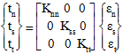 ここで、tn、ts、tt は 3 方向の表面力です。対応する方向の基準ひずみは n、εs、εt です。基準ひずみは、粘性要素の基準厚さ To (初期厚さとも呼ばれます)を使用した 3 つの分離(δ)と関連しています。