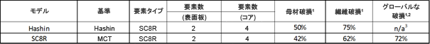 上記に示すように、Hashin 基準ではローカルの母材破損が MCT (42%)で予測されるよりも高い荷重レベル(50%)で発生すると予測しています。この違いは、完全に MCT と Hashin モデルで使用される母材構成破損基準の違いによるものです。たとえば、構成の平均応力に対して複合材料の平均応力、各モデルで使用される応力に基づく破損基準の特定の関数形式などによる違いです。