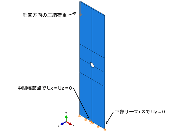 モデルは 6 x 1.5 インチのプレートで構成され、0.125 インチの半径穴がプレートの中心にあり、完全に統合された SOLID185 要素を使用します。レイアップは [45/-45/0/902]S で、層の厚さは 0.005 インチであるため、プレートの厚さは 0.05 インチになります。プレートの初期温度は華氏 72°で、テスト温度は華氏 140°でモデル化されます。最初の解析ステップで、プレートの温度は華氏 140°に上昇します。2 番目のステップでは、最終的な破損に至るまで、変位でコントロールされる圧縮荷重がプレートに適用されます。メカニカル荷重前のステップで熱荷重を適用することを強くお勧めします。これは、熱誘起変位が荷重-変位曲線に大きなシフトを発生させる可能性があり、荷重-変位曲線の解釈が困難になるためです。荷重と境界条件が下図に示されています。図では、0°層の方向は全体 Y 軸に一致しています。