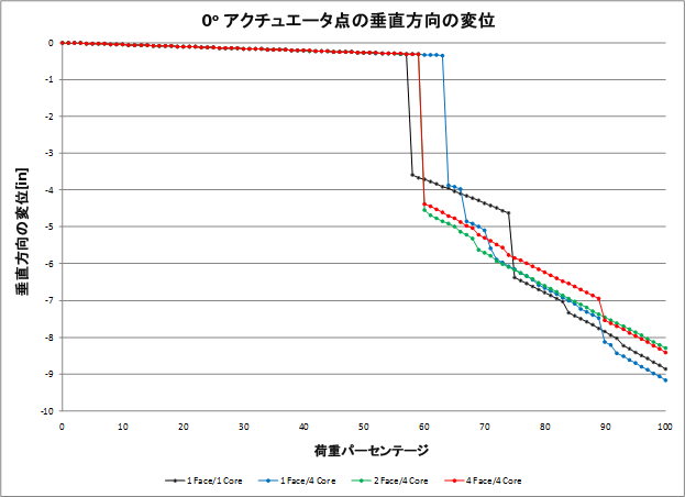 次の表は、4 つのモデルが予測する、各タイプの破損イベント時の荷重レベルを示します。次のプロットは、複合材料構造の全体的な垂直荷重-変位曲線を示します。