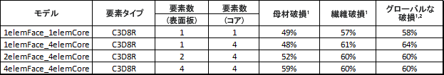 厚さ方向のメッシュ密度が増加すると、母材破損と繊維破損両方の開始は遅延しますが、予測されるグローバルな構造破損は、厚さ方向のメッシュ密度によって大きな影響は受けません。この見識は、厚さ方向のメッシュ密度が増加すると、ローカルの破損開始からグローバルな構造破損への進展がより急速になることを示唆します。より高い密度のメッシュでは、ローカルの破損からグローバルな破損への進展がより急速になると予測するのは妥当です(上の表を参照)。高いメッシュ密度では、評価する破損基準のガウス積分点数が増加するため、結果的に構造の破損パスはより細かくなります。より細かい破損パスは、破損の進展を加速化するため、ローカルの破損からグローバルな破損により急速に進展します。