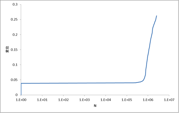 また、構造の破損していない領域に対する節点変位と破損サイクルを使用して、構造破損のサイクルをプロットすることもできます。上記の例では、荷重がコントロールされ、プレート上部の変位はすべて同じです。プレート上部の変位の関数として、任意の破損していない領域のサイクル数をプロットすると、次のようなプロットが生成できます。