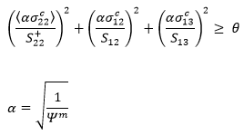 α は一方向母材破損基準 ψm を使用して計算されたスケール係数です。θ は要素の削除開始をコントロールする、ユーザ定義のしきい値を表します。θ の既定値は 0.75 です。θ は 0 < θ ≤ 1 の範囲にある必要があります。複合応力の成分 σ22c、σ12c、σ13c だけが、分割の評価に使用されることに注意してください。これらは、母材の縦方向の分割に影響する応力成分です。σ22c を囲むマコーレーのカッコは、応力が引張である場合の母材分割の評価にだけ σ22c が影響を与えることを示しています。