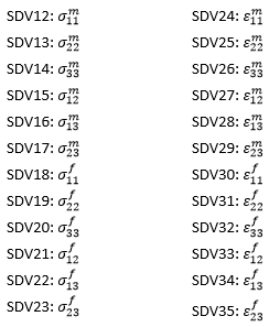 一方向複合材料を使用する進行性疲労解析の場合、SDV8~SDV31 は、母材の平均の応力状態とひずみ状態、および繊維の平均の応力状態とひずみ状態の個別の成分(静的解析の SDV12~SDV35と同等)を格納します。