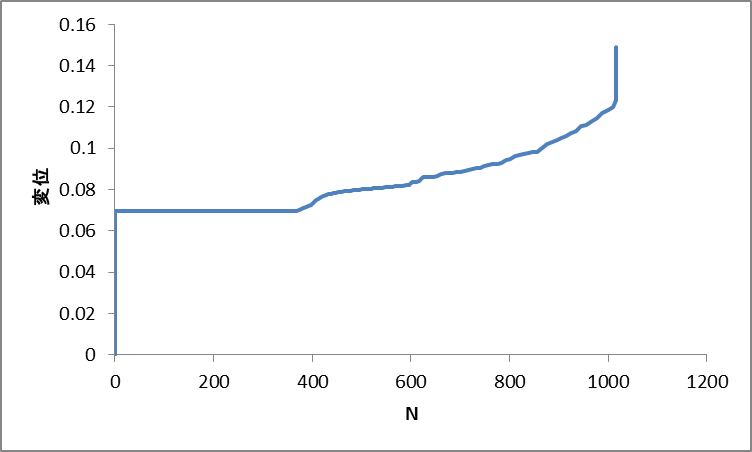 また、構造の破損していない領域に対する節点変位と破損サイクルを使用して、構造破損のサイクルをプロットすることもできます。上記の例は荷重制御され、プレート上部の変位はすべて同等です。任意の破損していない領域のサイクル数をプレート上部の変位の関数としてプロットすると、以下のようなプロットを生成することができます。