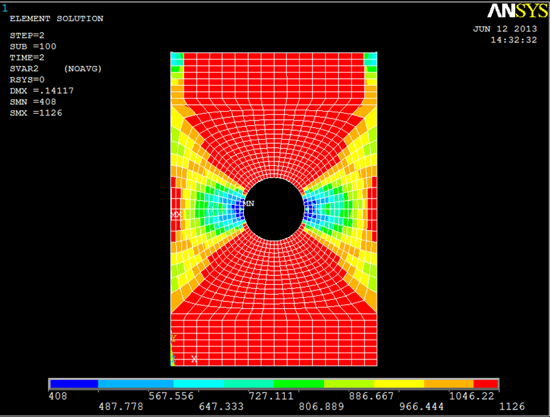 上記の状態変数のいずれも、このドキュメントで説明する手順に従ってコンタ プロット上に表示することができます。ANSYS APDL での開いた穴のテンション試験片に対する破損サイクルをコンタ プロットで表現した例を以下に示します。