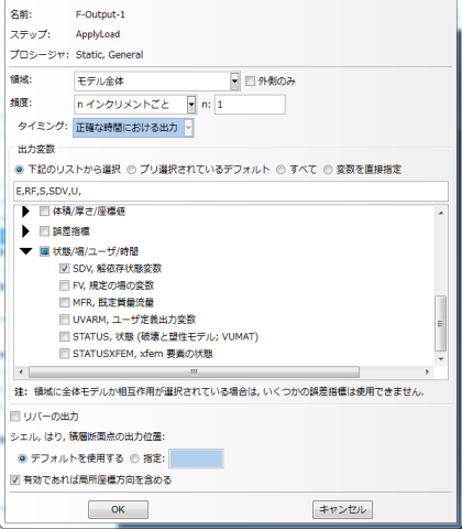 - 以下に示すように、SDV のボックスをオンにすることにより、[Output Variables]のリストに SDV を追加します。これで、状態変数が Abaqus 出力(.odb)ファイルに出力されるようになります。
