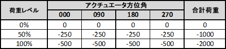 4 つのアクチュエータを使用して、円錐形構造(上図)の上部にある荷重先頭に集中した垂直方向の圧縮力を適用しています。次の表は、荷重先頭の 4 つの位置それぞれに適用される圧縮力の一覧です。これらの力は均一な垂直方向の圧縮荷重になり、100% の荷重は 200,000 lbs の垂直方向の合計圧縮力に対応しています。