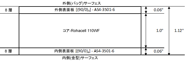 複合材料の円錐形構造は、サンドイッチ パネル構造の特徴を備えています。サンドイッチ パネル(下図)の厚さ方向のプロファイルは、フープおよび円錐の軸方向で均一になります。サンドイッチ構造の内側および外側の複合材料面シートには、内側サーフェスから測定して [(90/0)4] のレイアップがあります(軸方向は0°、フープ方向は90°)。各複合材料層は 0.0075 インチの厚さで、炭素/エポキシ AS4-3501-6 で構成されます。1 インチの厚さのコアは、等方性フォーム材料(Rohacell 110 WF)です。