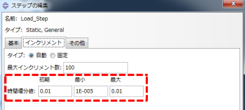 進行性破損解析で望ましい時間増分パラメータを指定することを推奨します。この製品を使用することでより安定した収束が得られるため、進行性破損解析に必要となる時間増分の減少(またはカットバック)の量は、ソフトウェアなしで実現可能な減少の量よりもはるかに少なくなることが予測されます。この特性は、時間増分パラメータの選択に影響を及ぼす場合があります。これらのパラメータは、以下に示すように[Edit Step]ダイアログ ボックスの [Incrementation] タブで指定することができます。時間増分の最大許容数、最初の時間増分値、時間増分の最小許容値、および時間増分の最大許容量の 4 つの設定を変更することができます。